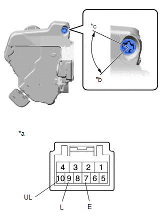 (a) Vérifier le fonctionnement du moteur de verrouillage de porte (pour côté conducteur). (1) Appliquer la tension de la batterie au connecteur du moteur et vérifier le fonctionnement du moteur de serrure de porte. OK: