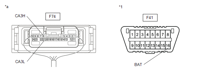 Il se peut qu'il y ait un court-circuit entre l'une des lignes de bus CAN et +B lorsqu'aucune résistance n'est détectée entre la borne 6 (CA3H) de l'ECU du portail d'accès central (ECU du portail d'accès au réseau) et la borne 16 (BAT) du DLC3 ou la borne 21 (CA3L) de l'ECU du portail d'accès central (ECU du portail d'accès au réseau) et la borne 16 (BAT) du DLC3.